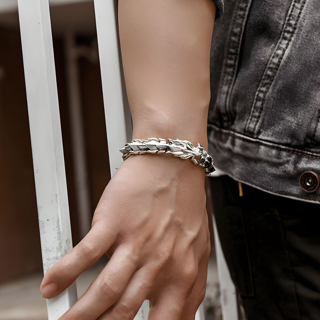 The Dravén Bracelet is a statement of controlled power — a seamless blend of art, rebellion, and precision. Every curve, every scale of the dragon head is sculpted with meticulous detail, reflecting light like liquid metal. The bone-inspired links add raw sophistication, balancing aggression with elegance.
