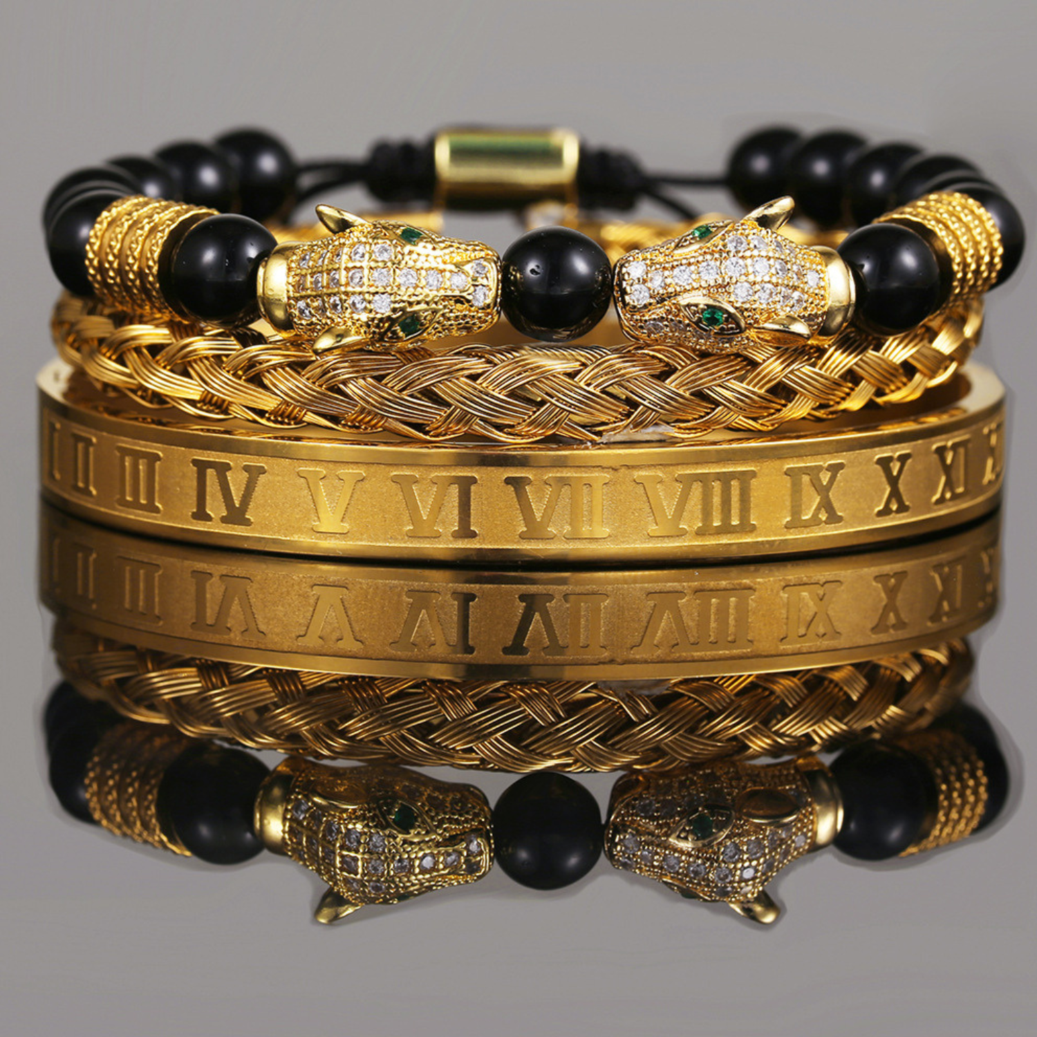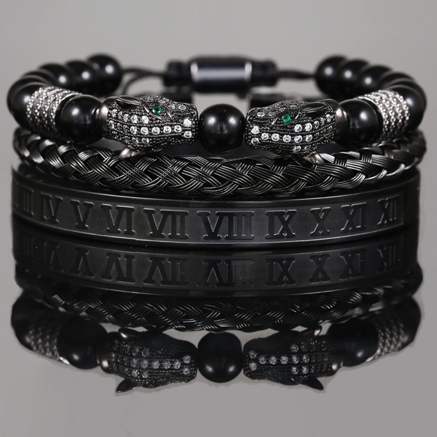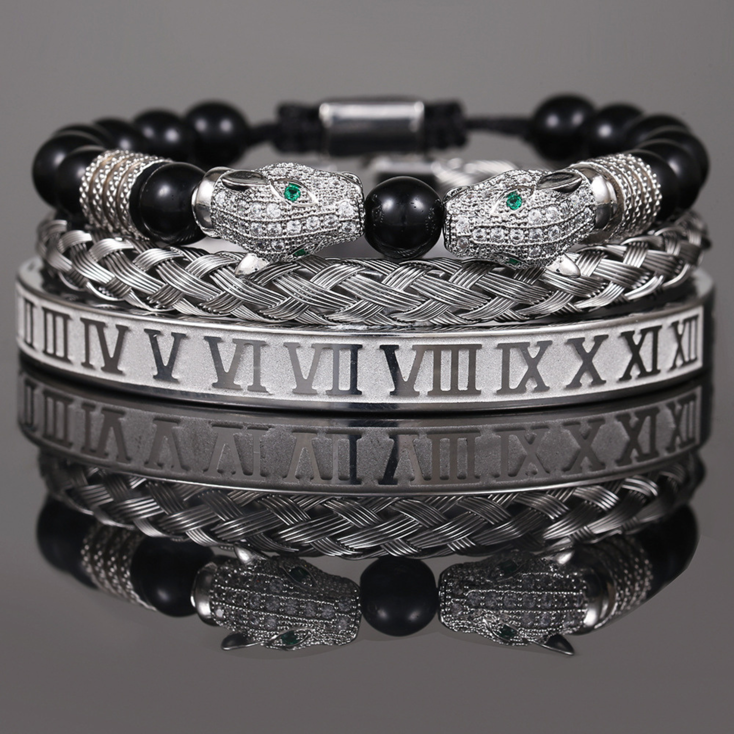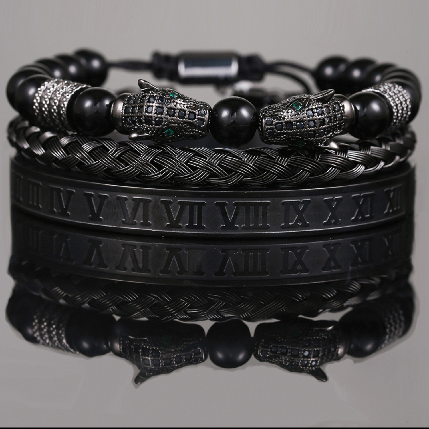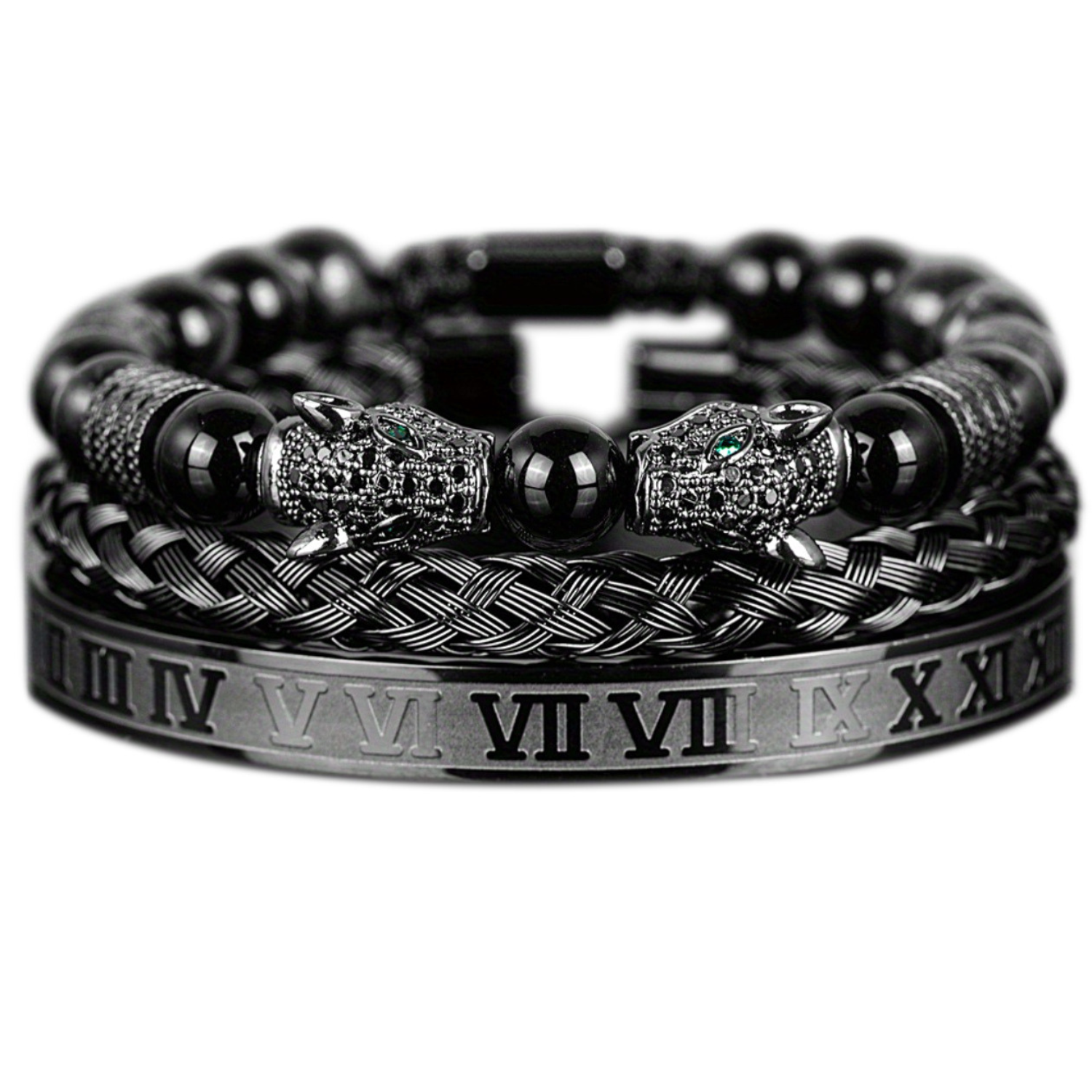 The Mondrélle Bracelet Set is a study in controlled power — a fusion of micro-zircon leopard heads, hand-woven black agate, and a polished stainless-steel Roman cuff, crafted for the gentleman who values both symbolism and style. Every element is intentional: the dual leopard heads radiate confidence and instinct; the agate beads ground the spirit with depth and resilience; the Roman bangle adds a timeless architectural precision. Together, they form a refined stack that elevates your wrist with quiet authority and unmistakable sophistication.