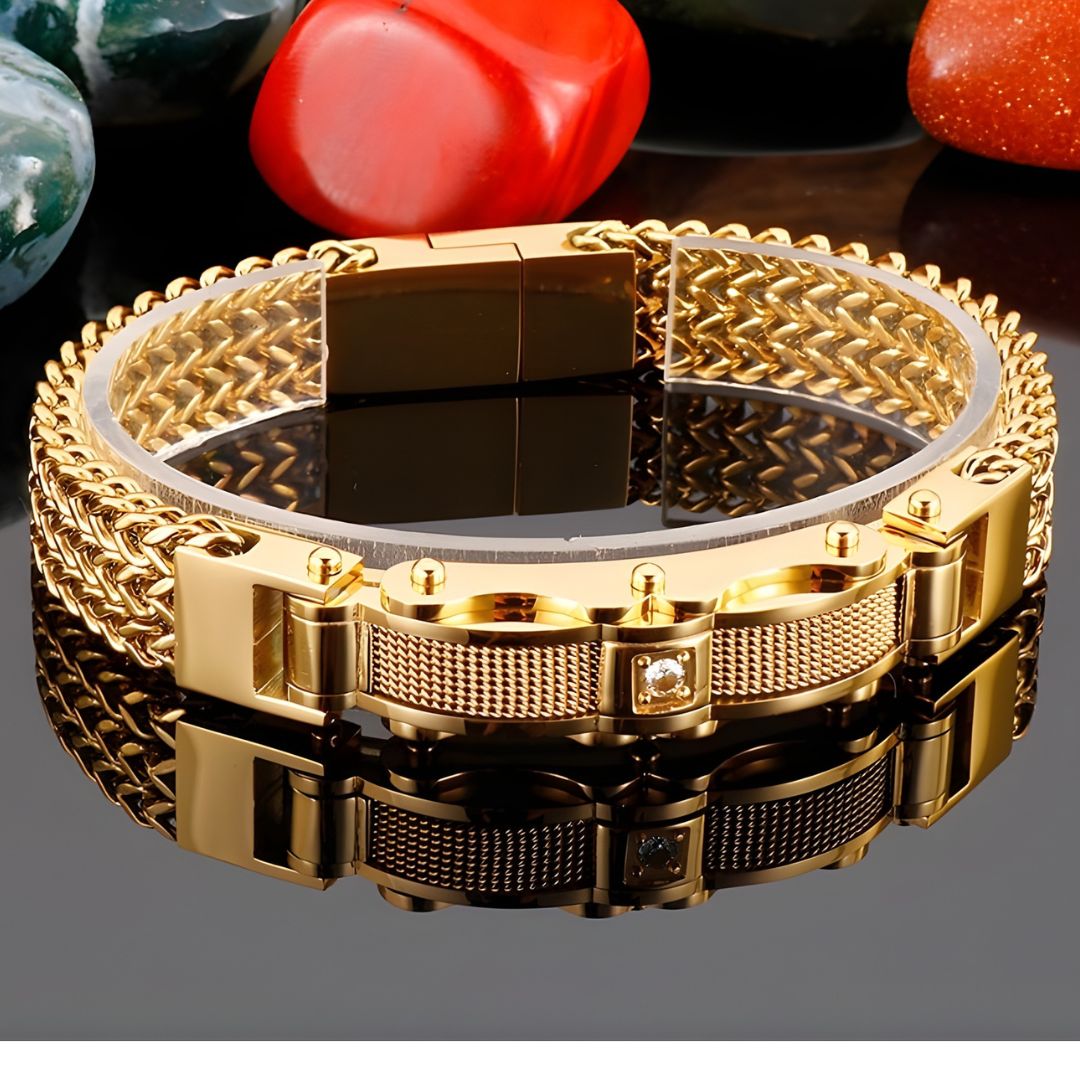 Forged from titanium steel and finished in gold brilliance, it embodies the tension between speed and stillness, grit and grace. Each diamond-set link is precision-engineered to move as fluidly as the man who wears it — reflecting ambition in every shimmer and intent in every turn of the wrist.